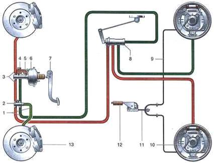 Рис.1.3. Схема гидропривода тормозов: 1 - трубопровод контура "левый передний-правый задний тормоз"; 2-сигнальное устройство; 3 - трубопровод контура "правый передний - левый задний тормоз"; 4 - бачок главного цилиндра; 5 - главный цилиндр гидропривода тормозов; 6 - вакуумный усилитель; 7 - педаль тормоза; 8 - регулятор давления задних тормозов; 9 - трос стояночного тормоза; 10 - тормозной механизм заднего колеса; 11 - регулировочный наконечник стояночного тормоза; 12 - рычаг привода стояночного тормоза; 13 - тормозной механизм переднего колеса.