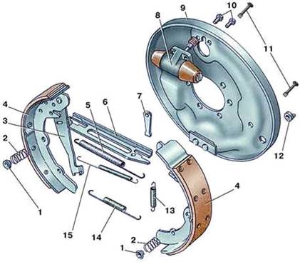 Рис. 1.4. Барабанный тормозной механизм заднего колеса: 1 - чашка; 2 - прижимная пружина; 3 - приводной рычаг; 4 - тормозная колодка; 5 - верхняя стяжная пружина; 6 - распорная планка; 7 - регулировочный клин; 8 - колесный тормозной цилиндр; 9 - тормозной щит; 10 - болт; 11 - стержень; 12 - эксцентрик; 13 - нажимная пружина; 14 - нижняя стяжная пружина; 15 - прижимная пружина распорной планки.