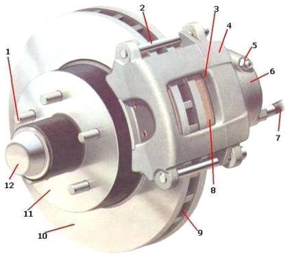 Рис. 1.5. Схема дискового тормозного механизма: 1 - колесная шпилька; 2 - направляющий палец; 3 - смотровое отверстие; 4 - суппорт; 5 - клапан; 6 - рабочий цилиндр; 7 - тормозной шланг; 8 - тормозная колодка; 9 - вентиляционное отверстие; 10 - тормозной диск; 11 - ступица колеса; 12 - грязезащитный колпачок.