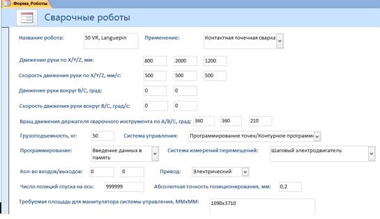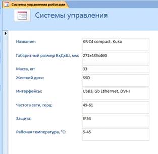 Рис.6 Пример формы для вывода из таблицы “Системы управления роботами”