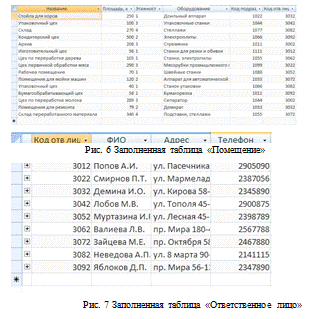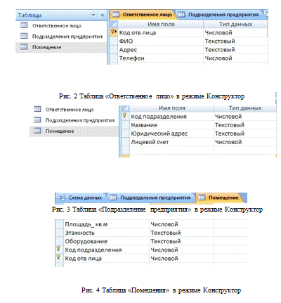 При нажатии на кнопки с вкладки «Таблицы» на экран выводятся формы, созданные на основании таблиц «Ответственные лица», «Подразделения предприятия» и «Используемые помещения».