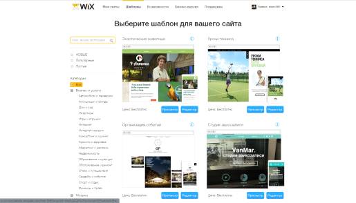 В левом меню находится рубрикатор с тематиками. С его помощью, я сможете нужный мне тип оформления. Под скриншотом находится информация о стоимости использования темы и две кнопки: «Просмотр» и «Редактор». При помощи кнопки «Просмотр» (или нажатию по миниатюре) можно посмотреть и попробовать избранный шаблон в действии, а кнопка «Редактировать» позволяет сразу перейти к работе над сайтом.