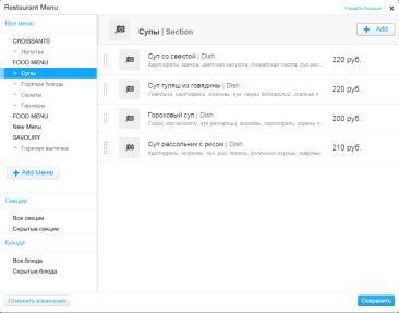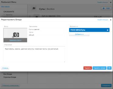 В открывшимся окнеRestaurantmenu (меню ресторана), мы можем добавить новое блюдо, редактировать старое, удалять, прикреплять фотографии, добавлять описание, тем самым полноценно управлять меню без особой сложности.