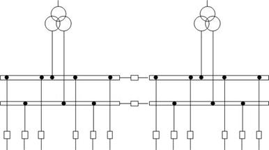 В качестве РУ НН примем схему с одной секционированной системой сборных шин (рисунок 6). Основной причиной, определяющей такой режим работы, является требование снижения токов короткого замыкания, хотя в этом случае отказ от непосредственной параллельной работы трансформаторов имеет свои отрицательные последствия: разные уровни напряжения по секциям, неравномерная загрузка трансформаторов и т.п. В данной схеме в нормальном режиме работы секционный выключатель отключен.