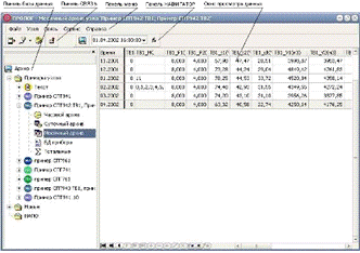Перечень таблиц определяется прибором учета, установленным на узле. Так, раскрытый на рисунке 3 узел учета "Пример СПТ942 ТВ1", оборудованный тепловычислителем СПТ942, характеризуется следующим набором таблиц: часовой, суточный (показан в окне просмотра) и месячный архивы, настроечные параметры (база данных) прибора и тотальные счетчики.