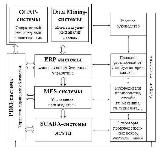 поступает в ERP-системы, и далее - на уровень высшего менеджмента предприятия (OLAP, Data Mining - интеллектуальный анализ данных) [6].