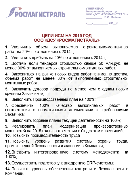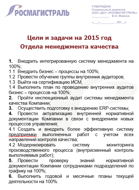 Руководством компании были обозначены цели на 2015 год, конкретно для отдела менеджмента качества (ОМК), где проводились работы по разработке данной научно - исследовательской работы.