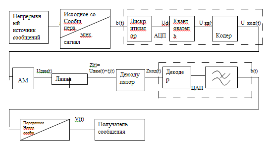 Непрерывное сообщение a(t) передается в первичный электрический сигнал (при помощи микрофона). Затем этот сигнал передается на АЦП. Преобразование аналог - цифра состоит из трех операций: