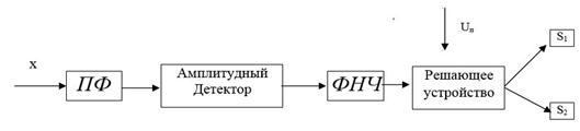 На вход приемника поступает сигнал х = Acoswt. После прохождения полосового фильтра ПФ с эффективной полосой пропускания Fэ, достаточной для получения всех наиболее существенных компонент сигнала, сигнал поступает на амплитудный детектор и ФНЧ, которые выделяют огибающую принимаемого колебания.