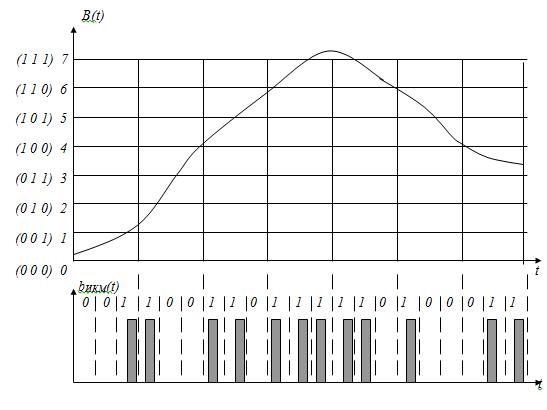 Сначала непрерывное сообщение подвергается дискретизации по времени через некоторые интервалы Dt, полученные отчеты мгновенных значении квантуются и наконец полученная последовательность квантованных значении представляется по средствам кодирования в виде последовательности m-ичных кодовых комбинации. Такое преобразование называется Импульсно-кодовой модуляцией. Чаще всего кодирование здесь сводится к записи номера уровня в двоичной системе счисления.