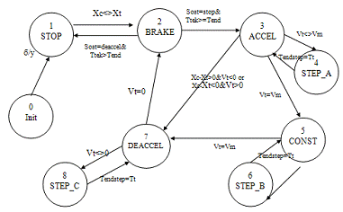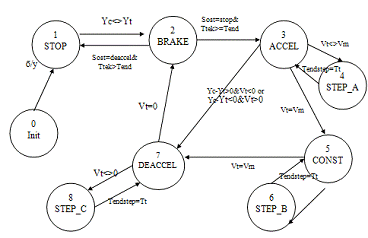 ). ACCEL. Состояние разгона. В этом состоянии происходит наращивание скорости, пока не сработает ДСС или не будет достигнута максимальная скорость. В первом случае произойдет переход в состояние торможения DEACCEL, во втором - в состояние движения на постоянной скорости CONST.