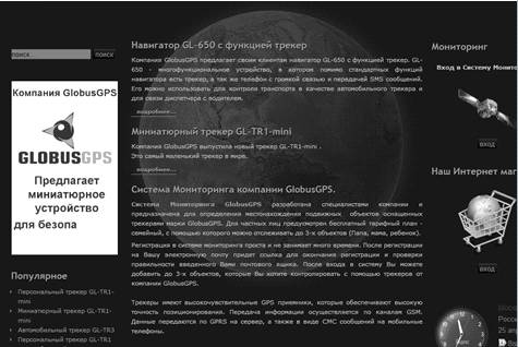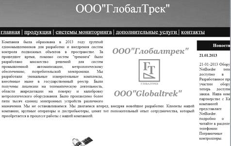 Главная страница хорошо отражает тематику сайта, она оформлена достаточно просто, не перегружена анимацией. На ней находится периодически обновляемая информация о событиях происходящих в данной фирме. На главной странице содержится функция поиска по сайту и карта сайта, а так же навигационная панель, расположенная сверху. Навигационная панель отображается на всех страницах,но сильно разбросана по углам страницы. При наведении курсора на раздел открывается список подразделов. Недостатком панели данного сайта является то, что всплывающие подразделы исчезают быстро и не всегда успевал их выбрать. Навигационная панель содержит разделы: услуги, дистрибьюция , продукция, о компании, контакты, вакансии. Это обычный набор разделов для сайта телеметрической фирмы.