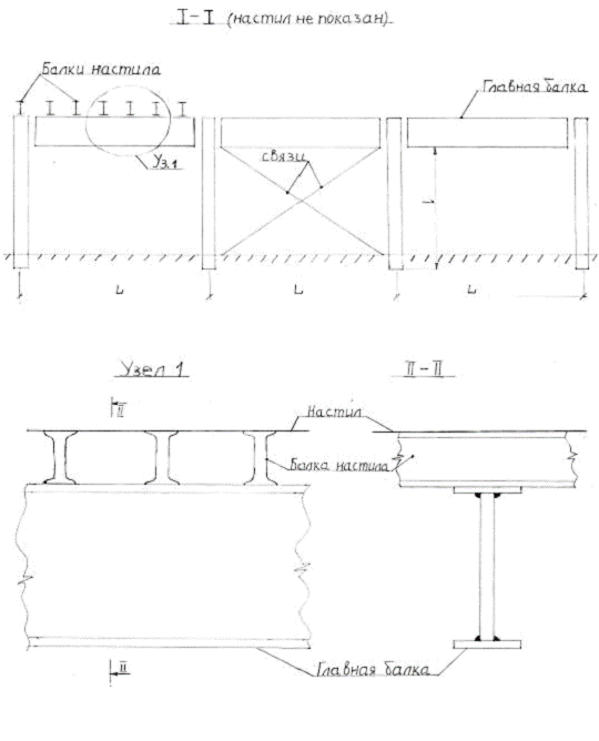 Компоновка конструктивной схемы рабочей площадки графически выполняется на формате А4 с соблюдением необходимых масштабов. Следует показать: план и разрезы рабочей площадки, схему связей, характерные узлы сопряжения конструктивных элементов, угловой штамп.