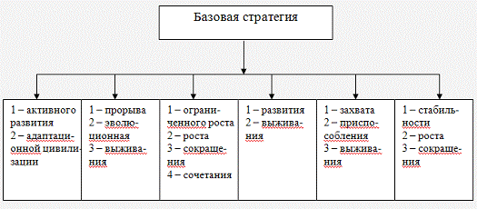 Базовая стратегия - это стратегия, которая описывает общее направление роста предприятия, развития его производственно-сбытовой деятельности. Она показывает, как управлять различными видами бизнеса, чтобы сбалансировать портфель товаров и услуг. Стратегические решения этого уровня наиболее сложны, так как касаются предприятия в целом [16].