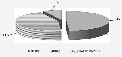 Согласно представленного рисунка видно, что наибольший удельный вес в структуре ассортимента реализуемой продукции ООО «Первая алкогольная компания» принадлежит водке - в 2011 г. это 49%, на втором месте находится вино - 44%, на третьем - другая продукция - 7%.