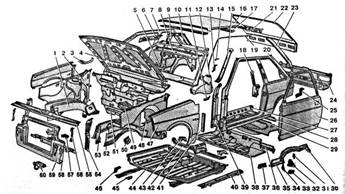 Кузова автомобилей ВАЗ 2108 и ВАЗ 2109 несущей конструкции, типа кузова хэтчбек трехдверный и пятидверный соответственно. Кузов автомобиля ВАЗ 21099 типа пятидверный седан. Кузова автомобилей ВАЗ 2109 и ВАЗ 21099 сконструированы на базе кузова автомобиля ВАЗ 2108, максимально унифицированы с ним по большинству узлов и отличаются только размерами и формой отдельных деталей. Поэтому в данном разделе рассмотрен ремонт кузова автомобиля ВАЗ 2108. Отличия кузовов автомобилей ВАЗ 2109 и ВАЗ 21099 описаны особо.