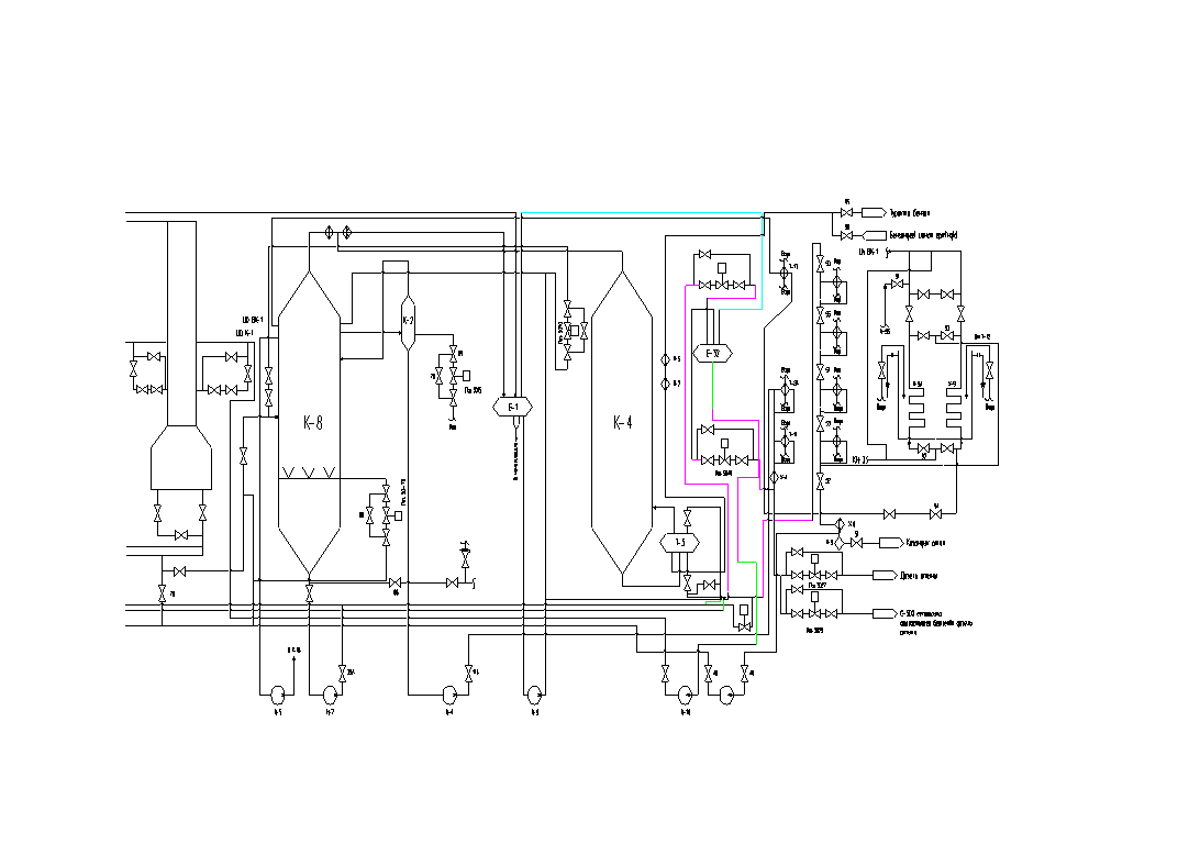 Нестабильный бензин с температурой 40оС подается насосом Н-9,9А на верхнюю тарелку клоны К-4. Тепло в низ колонны подводится горячим котельным топливом через кипятильник Т-3. Температура паров из кипятильника регулируется регулятором поз.126А, клапан регулятора установлен на линии подачи котельного топлива в Т-3. Газ с верха К-4 поступает в линию паров из К-1 перед холодильником Х-1.