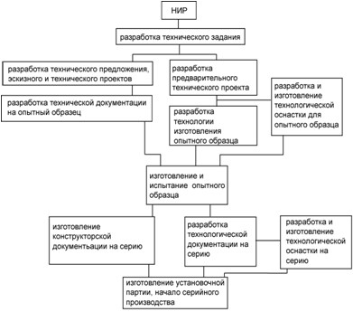 Полная схема разработки нового изделия включает следующие основные этапы: научно-исследовательские работы (далее НИР), опытно-конструкторские и опытно-технологические работы (далее ОКР), освоение производства (рис.1.1.1).