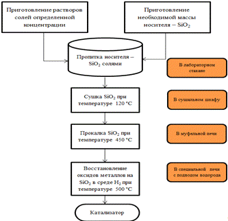 разработать рецептуры и методики приготовления нанесенных и сплавных катализаторов.