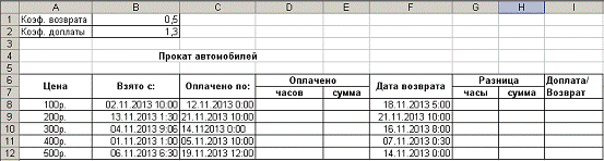 a. если клиент фактически вернул машину раньше оплаченной даты, то мы ему должны вернуть только половину суммы из столбца "Разница", применив коэффициент возврата 0,5;. если клиент фактически вернул машину позже оплаченной даты, то мы с него должны взять сумму из столбца "Разница" больше в 1,3 раза, применив коэффициент доплаты 1,3.