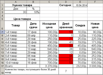 < =ЕСЛИ (D7>30; C7*$B$3; 0) >, которая будет определять скидку на товар (10%), срок хранения которого превысил 30 дней. Размножим формулу в ячейки Е8: Е16. Установим с столбцах С, Е, F формат "Денежный".