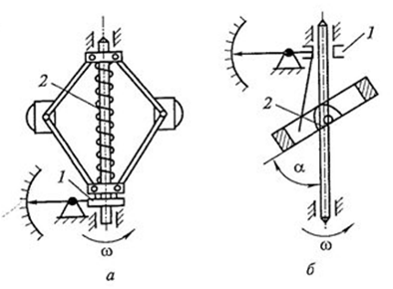 В коническом тахометре (рис. 1, а) на шарнирах, вращающихся вместе с осью, установлены грузики т, которые под действием центробежных сил расходятся, перемещая вдоль оси муфту 1 и сжимая пружину 2. Изменение положения муфты 1 регистрируется показывающим элементом тахометра - стрелкой. В кольцевом тахометре (рис. 1, б) при невращающейся оси 2 (щ = 0) плоскость кольца наклонена по отношению к оси на определенный угол. При вращении кольцо стремится занять положение, перпендикулярное оси вращения, и вызывает перемещение муфты 1 и стрелки отсчетного устройства.