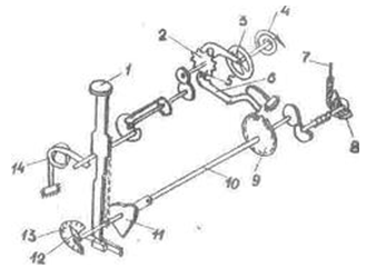 колесом 9, неподвижно сидящим на центральной оси. Приводной валик 7 был
