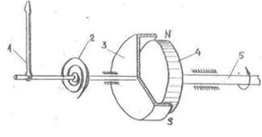 Постоянный магнит 4 соединен с осью тахометра 5. При движении магнита его магнитное поле непрерывно пересекает цилиндрический колпачок 3 из алюминия. Возникающие в толще алюминия вихревые токи взаимодействуют с магнитным полем и увлекают колпачок в сторону вращения магнита. С осью колпачка связана стрелка указателя 1. Противодействующий момент создается спиральной пружиной 2. Сила взаимодействия вихревых токов, индуктируемых во вращающемся колпачке, и магнитного поля зависит от скорости вращения. Поэтому угол отклонения стрелки пропорционален скорости вращения выходного вала и шкала магнитного тахометра равномерная.
