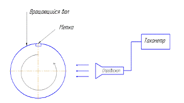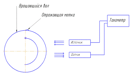 Третий способ измерения скорости вращения описан на рисунке 11. Это бесконтактный метод, основанный на отражении света от маркера, нанесенного на вращающуюся часть машины.