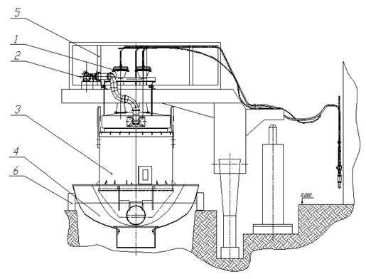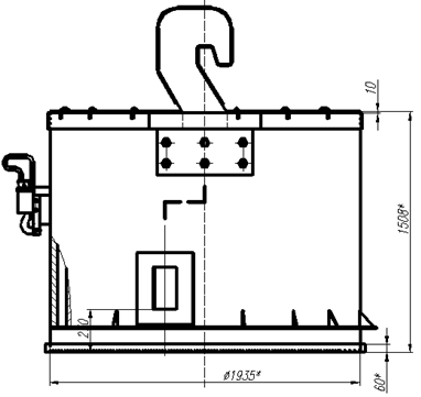 В разработанной установке (см. рис.3) средняя температура подогрева шихты составляет 550-6500С. Нагрев производится в двухкорпусной бадье (внутри бадьи вставлена сменная обечайка с зазором) (см. рис.4). По кольцевому зазору продувается холодный воздух. При этом температура нагрева корпуса бадьи не превышает 2500С. Данная установка позволяет производить высокотемпературный нагрев, имеет сравнительно небольшие размеры (3210x7130x5190) и вес (12 тонн). Высокопроизводительна.