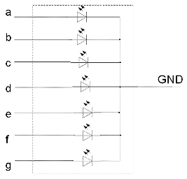 Все семь светодиодов соединены анодами ("минусовыми" выводами) вместе. Для того, чтобы отобразить какой-либо символ, либо цифру, нужно на катоды тех светодиодов, которые необходимо "засветить" подать логическую "1", на остальные логическую 1.