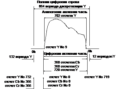 Из 864 отсчетов яркости 720 отсчетов относятся к цифровой активной части строки, но только 702 из них входят в аналоговую активную часть. Полная строка начинается с отсчета Y0 и заканчивается отсчетом Y719. Отсчет Y732 должен совпадать с серединой фронта синхроимпульса аналогового сигнала (с моментом 0h). 10 отсчетов слева и 8 отсчетов справа от аналоговой активной части обеспечивают защитный интервал, предотвращающий проникновение нежелательных цифровых краевых эффектов в видимую зрителем часть строки. Восемнадцать крайних отсчетов не гасятся в цифровых трактах, но подлежат гашению при цифро-аналоговом преобразовании. В оптимальном варианте гашение происходит методом плавного двустороннего ограничения (dynamic clipping) с соблюдением предусмотренной стандартом длительности фронтов гашения, однако во многих реальных устройствах эта операция выполняется более грубыми методами.