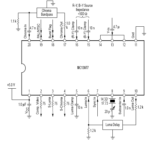 Компонентный аналоговый сигнал Y,U,V должен попасть на вход кодера. В качестве кодера используем микросхему МС13077 - высококачественный видео кодер способный преобразовывать компонентные аналоговые сигналы RGB или YUV в сигнал стандарта PAL или NTSC. ИС состоит из матрицы яркости и цветоразности, модуляторов, осциллятора поднесущей частоты, и логики, которая позволяет кодировать компонентный сигнал в композитный в соответствии с телевизионными стандартами. Кодер потребляет менее 75мА, что делает его удобным в использовании в портативных устройствах.