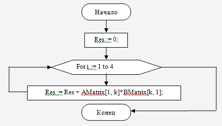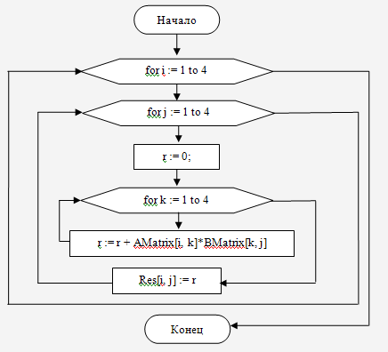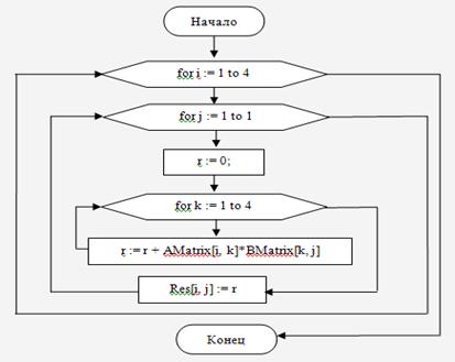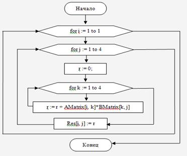 var i, j, k : integer - это переменные цикла.: real; - это искомая переменная, результат вычислений., BMatrix : Matrix44 - это присвоение массиву AMatrix и BMatrix значений двумерного массива Matrix44.Res : Matrix44 - это присвоение переменной Res значений двумерного массива Matrix44.