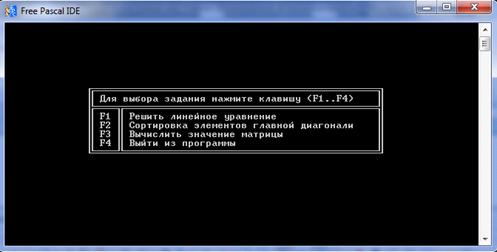 ) Реализация диалогового интерфейса меню для взаимодействия с пользователем. Выбор соответствующего пункта меню запрограммирован на клавиши F1…F4, это реализовано с помощью оператора выбора (селектора) case. Если значение селектора совпадает с каким-либо значением в операторе case, то выполняется ветка, относящаяся к данному случаю. При нажатии, например клавиши F1 происходит переход в процедуру zadacha1 и т.д.