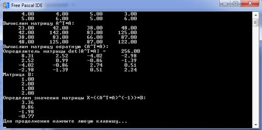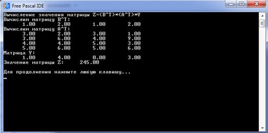 Trans41(B, P);j := 1 to 4 do(P[1, j]:10:2);(' ');;;('Вычислим матрицу A^T:');(A, M);i := 1 to 4 doj := 1 to 4 do(M[i, j]:10:2);(' ');;;;('Матрица Y:');i := 1 to 4 do(Y[i, 1]:10:2);(' ');;;(P, M, P);(P, Y, r);('Значение матрицы Z: ', r:10:2);