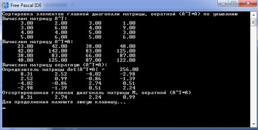 repeatKeyPressed;;zadacha2;M : Matrix44;: array[1..4] of Real;, j, ni, nj : integer;: real;: boolean;;('Сортировка элементов главной диагонали матрицы, обратной (A^T*A) по убыванию');