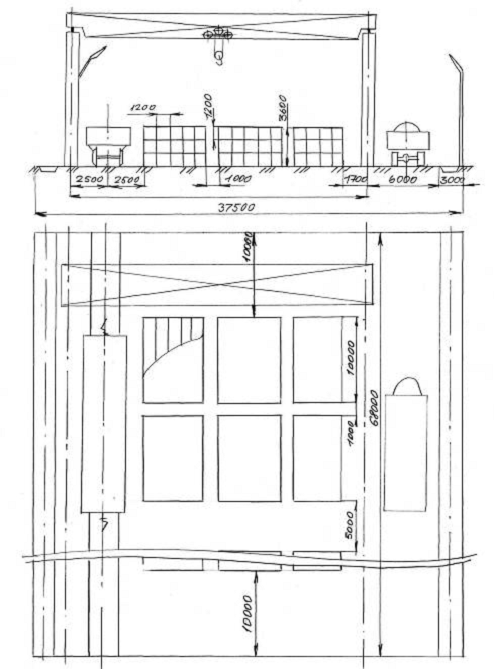 мостового крана груз также размещен в пролете. Но в трех штабелях по три яруса