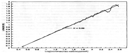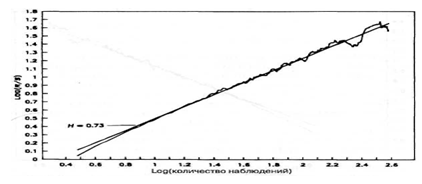 , где c = const, а H - показатель Херста. Предварительно логарифмируем обе