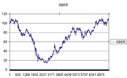 Для численных экспериментов были взяты котировки обычных акций Сбербанка за период с 20.07.2007 по 04.08.2011 с интервалом час (длина ряда равна N=7926). График исходных данных показан на рисунке 1.5 .