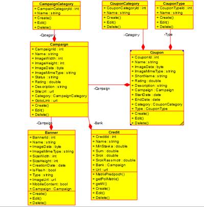 Класс CouponCategory также предназначен для хранения информации о категориях купонов (специальных предложений и акций) на потребительские кредиты. Он содержит поля, аналогичные полям класса CampaignCategory. В то же время, класс CouponType предназначен для хранения типов купонов.