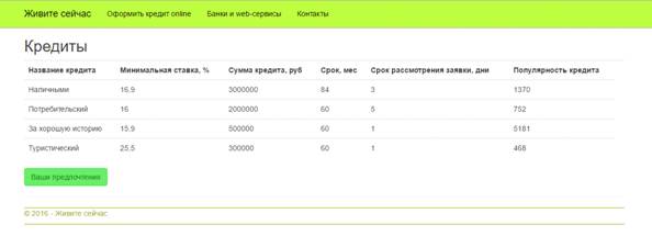 В данной выпускной квалификационной работе было произведено исследование предметной области, рассмотрены существующие аналоги, проанализированы актуальность и новизна разрабатываемого web-приложения. Также были выбраны методы реализации web-приложения, необходимого для предоставления актуальной информации по потребительским кредитам различных банков. Разработанное приложение способно автоматически обновлять информацию по доступным кредитам и специальным предложениям, сортировать кредиты, выдавать рекомендацию пользователю в зависимости от его предпочтений на основе метода анализа иерархий, приносить разработчику прибыль в виде процентов от оформленного пользователем кредита через приложение.