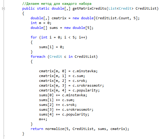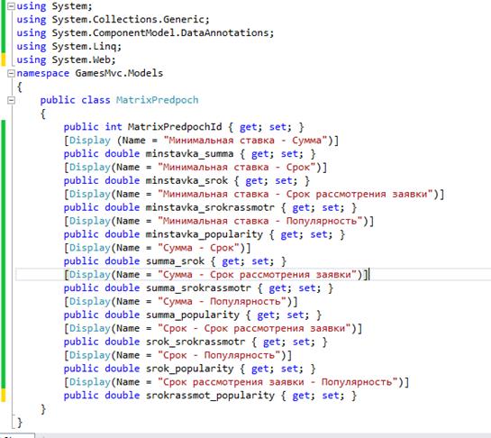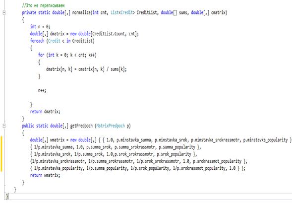 Класс Credit одним из главных классов приложения, так как основной его задачей является предоставление кредита и выбор наиболее выгодного для конкретного пользователя. В отличие от других классов, которые имеют только методы Create, Edit и Delete для того, чтобы администратор мог вручную добавлять, изменять и удалять данные, класс также имеет функции - MatrixPredpoch (для обработки результатов матрицы предпочтений пользователя), getPolMatrix (для расчета матрицы полезности), getW (для расчета весов). Поле CreditId является первичным ключом класса. Поле Name хранит информацию о названии кредита, поле MinStavka хранит информацию о минимальной ставке займа, поле Sum хранит максимальную сумму кредита, Srok содержит информацию о сроке кредита, Srokrassmotr определяет длительность рассмотрения заявки на кредит, Campaign является внешним ключом на банк, предоставляющий этот кредит, поле Url хранит ссылку на официальный сайт банковского займа.