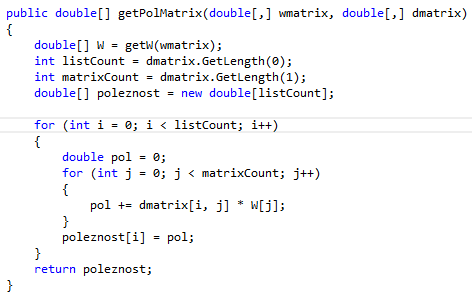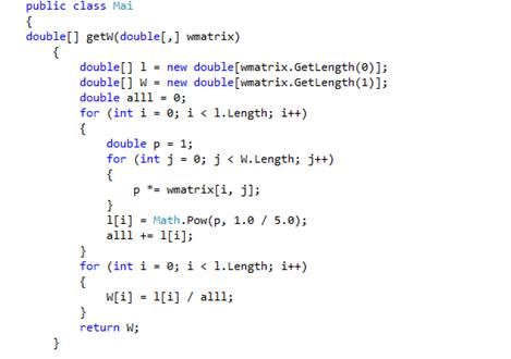 После того, как матрица критериев составлена, необходимо посчитать собственные вектора критериев и их веса, используя соответственно формулы (1) и (2). Получаем: