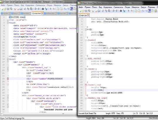 Написание кода производим в редакторе Notepad++. Намеренно не используется никаких CMS или фреймворков для получения большего опыта в сайтостроении. Преимущество верстки стандартными средствами заключается в том, что код получается более "чистым", а значит, быстрее загружается и проще адаптируется под специфические нужды. Недостаток такой верстки заключается в требовании значительно большего времени, чем использование фреймворков.