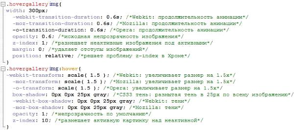 Блок с фотогалереей реализован только средствами HTML и CSS. Использован параметр hover, срабатывающий при