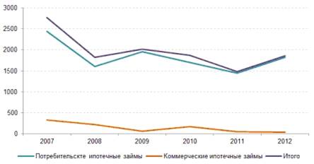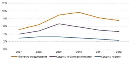 потребительским ипотечным займам упал к 2012 году на 34.3%, а вот задолженность