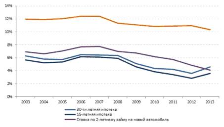 В мае 2013 года в связи с заявлениями главы ФРС Бена Бернанке о возможном сокращении QE3 резко подскочили ставки по основным видам кредитования. Так ставка по 30-ти летнему ипотечному займу с мая 2013 года выросла с 3.38% до 4.59% к сентябрю 2013 года, то есть на почти 35.8%. Аналогичная ситуация наблюдалась и со ставкой по 15-ти летнему займу, которая за тот же период выросла с 2.88% до 3.84%, то есть на 33.3%. В целом же даже такие ставки по главным ипотечным продуктам выглядят вполне приемлемыми для потребителей на фоне ставок в 2003-2009 гг [26, с.83]. Так в 2007 кризисном году 30-тилетняя ставка находилась на отметке 6.5%, а 15-тилетнюю ставка была на 6.1%. В 2009 году, когда каким-то образом нужно было подстегнуть спрос на рынке недвижимости, ставки по 30-ти и 15-ти летней ипотеке упали до уровней 5.1% и 4.6% соответственно и продолжали падать до апреля 2013 года. На фоне увеличивающихся слухов о сокращении программы QE3 ФРС США ставки по основным ипотечным продуктам скорее всего продолжат свой рост.