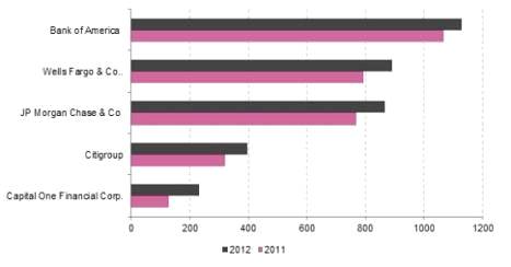 Выручка данных пяти крупнейших банков США в 2012 году составила $352.1 млрд. Это на 31.1% больше, чем в 2007 году. Чистая прибыль выросла с 2007 года на 26.3% к 2012 году, а с 2009 года по 2012 год выросла на 76.5%. Чистая рентабельность в данный момент выходит на уровень 2006-2007 гг. В 2012 году рентабельность по чистой прибыли составляла 15.6% по сравнению с 16.2% в 2007 году. Среднее соотношение долг/активы по сравнению с 2009 годом уменьшилось и в 2012 году составило 21.2%.
