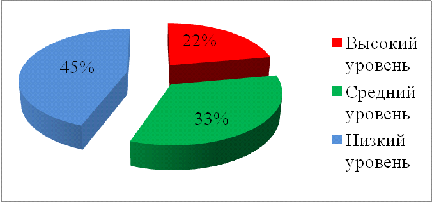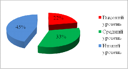 Высокий уровень эмоционального развития 22% (2 воспитанника), средний уровень эмоционального развития 33% (3 воспитанника), низкий уровень эмоционального развития 45% (4 воспитанника).